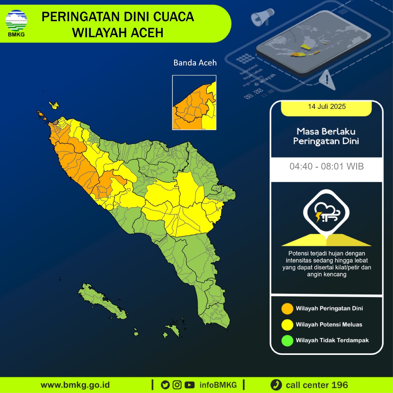 Dalam rilis yang disampaikan BMKG pada pukul 04.30 WIB, Senin (14/7/2025) disebutkan bahwa akan terjadi hujan sedang hingga lebat disertai kilat/petir dan angin kencang mulai sekitar pukul 04.40 WIB di beberapa wilayah, khususnya. Kabupaten Aceh Barat: Sungai Mas, Woyla, Woyla Barat, Woyla Timur, Panton Reu. Kabupaten Aceh Besar: Lhoong, Lhoknga, Indrapuri, Sukamakmur, Darul Imarah, Peukan Bada, Pulo Aceh, Kota Jantho, Kota Cot Glie,Kuta Malaka, Simpang Tiga, Darul Kamal, Leupung. Kabupaten Aceh Jaya: Teunom, Krueng Sabee, Setia Bhakti, Sampoiniet, Jaya, Panga, Indra Jaya, Darul Hikmah, Pasie Raya dan Kota Banda Aceh: Baiturrahman, Kuta Alam, Meuraxa, Syiah Kuala, Lueng Bata, Kuta Raja, Banda Raya, Jaya Baru, Ulee Kareng.