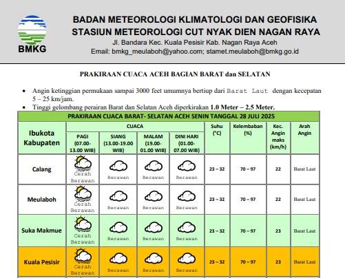 Nagan Raya | Meuligoenews.com – Badan Meteorologi, Klimatologi, dan Geofisika (BMKG) merilis prakiraan cuaca untuk wilayah Aceh bagian barat dan selatan pada Senin, 28 Juli 2025. Berdasarkan laporan resmi yang dikeluarkan oleh Forecaster On Duty, Rijal Sainsfikri, S.Tr. Met., cuaca secara umum diprediksi akan cerah berawan sepanjang hari di hampir seluruh ibu kota kabupaten di wilayah tersebut.