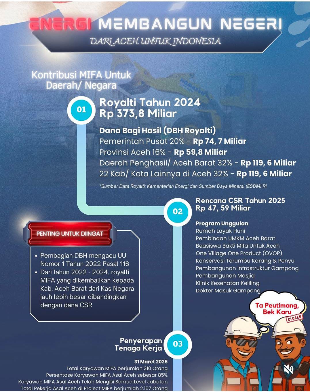 Meuligoenews.com, Aceh Barat – Perusahaan tambang batu bara PT Mifa Bersaudara mencatatkan kontribusi signifikan bagi negara dan daerah sepanjang tahun 2024, dengan total setoran royalti mencapai Rp 373,8 miliar. Dana tersebut menjadi bagian dari pendapatan negara yang dibagikan melalui skema Dana Bagi Hasil (DBH) royalti.