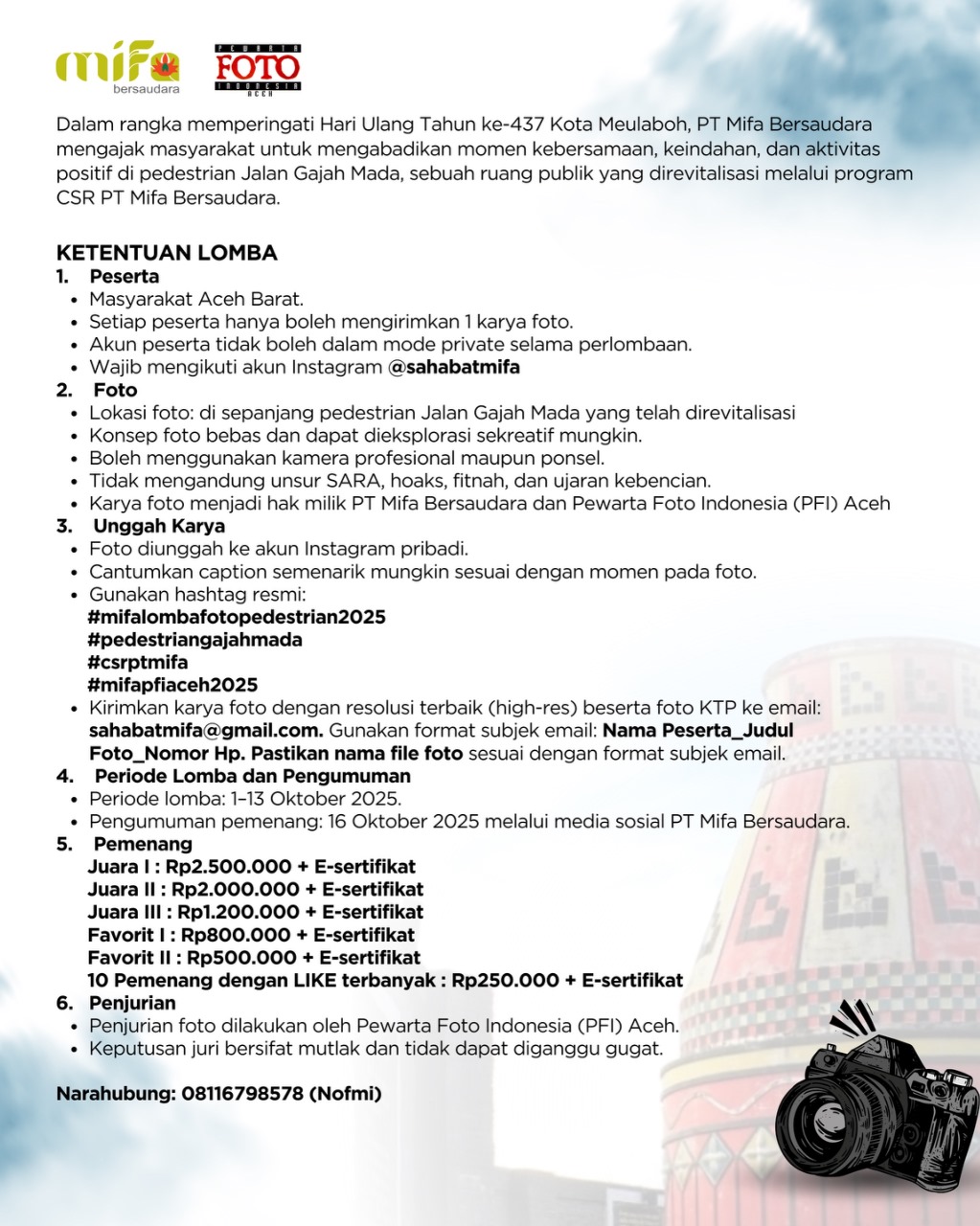 Foto harus diambil di sepanjang pedestrian Jalan Gajah Mada yang telah direvitalisasi, dengan konsep bebas sesuai kreativitas. Peserta dapat menggunakan kamera profesional maupun ponsel. Foto wajib diunggah ke akun Instagram pribadi dengan caption menarik serta mencantumkan hashtag resmi, #mifalombafotopedestrian2025,#pedestriangajahmada, #csrptmifa, dan #mifapfiaceh2025.